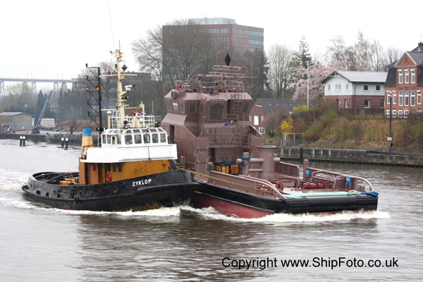 Veteran Polish tug CYKLOP passes Southbound with a newbuild tug hull on 26th April.