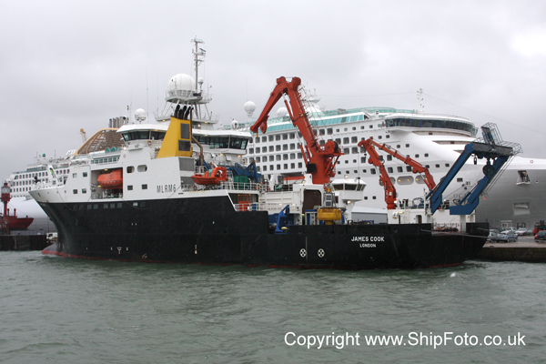 Once the formalities of the AGM were complete, we cast off for a cruise around Southampton Docks and down to Fawley. Photographic opportunities were severely limited due to the wind and heavy rain which was now falling. This didn't deter a few hardy souls from venturing out on to the open deck to take some photos. In the Eastern Docks was the vehicle carrier Talia, as well as P&O's Oceana at the Ocean Cruise Terminal. The reserarch ship James Cook was also at 49 berth.