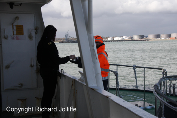 Then something very unusual happened. The Captain of the Wight Scene knew the Pilot on the incoming container ship MAERSK ENFIELD 11/141649 and also the Captain on the harbour launch Spitfire. The Pilot came on the bridge wing to wave to the Wight Scene. A few seconds later the Spitfire came right alongside the Wight Scene requesting cups of tea for his crew for letting us get so close. The transfer was completed safely in a couple of minutes then the Spitfire rushed away. But did they ever get their cups back I wonder? We then turned back towards Southampton following Maersk Enfield on the Hamble side.