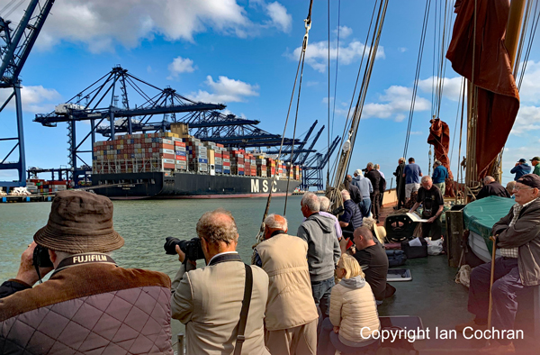 By the time the Breb Star had departed, It was time to board our vessel for the day, the Thistle. She was built in 1895 at Port Glasgow and is the oldest surviving iron hulled sailing barge still sailing. From 1940 she was trading for the London and Rochester Trading Company. She continued trading until 1972 and then passed through several owners until she was restored in Greenwich in 1987. She is a fine vessel with plenty of open deck space and ideal for a TSS cruise. We set off and headed for the River Orwell up to Ipswich. On the way we passed the large containership MSC Maria Saveria at the Trinity Container Terminal, Felixstowe. We were fortunate to photograph her on the way up the river as she had departed for Rotterdam by the time we returned from Ipswich.