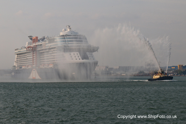 CELEBRITY BEYOND receiving the traditional water spraying escort.