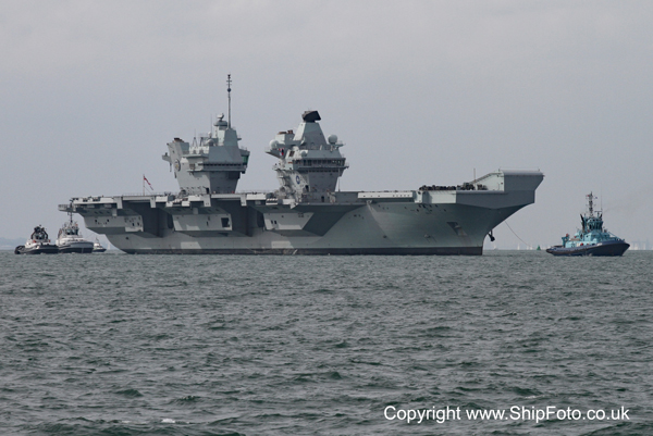 HMS PRINCE OF WALES being towed through the Solent and into Portsmouth.