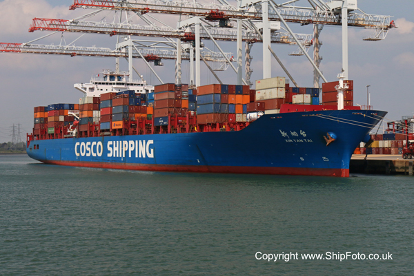 COSCO containership XIN YAN TAI at the container terminal, Southampton.